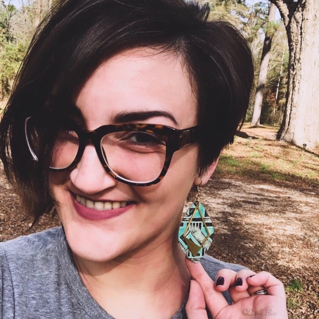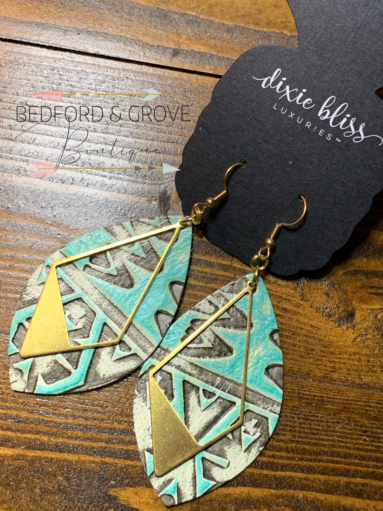 Rio measures 3.5" from they top of hook and features Aztec Stamped Turquoise genuine leather. On a gold tone stainless steel fish hook, sporting a brass geometric accent. Back side is grey suede. Light weight for sensitive ears!