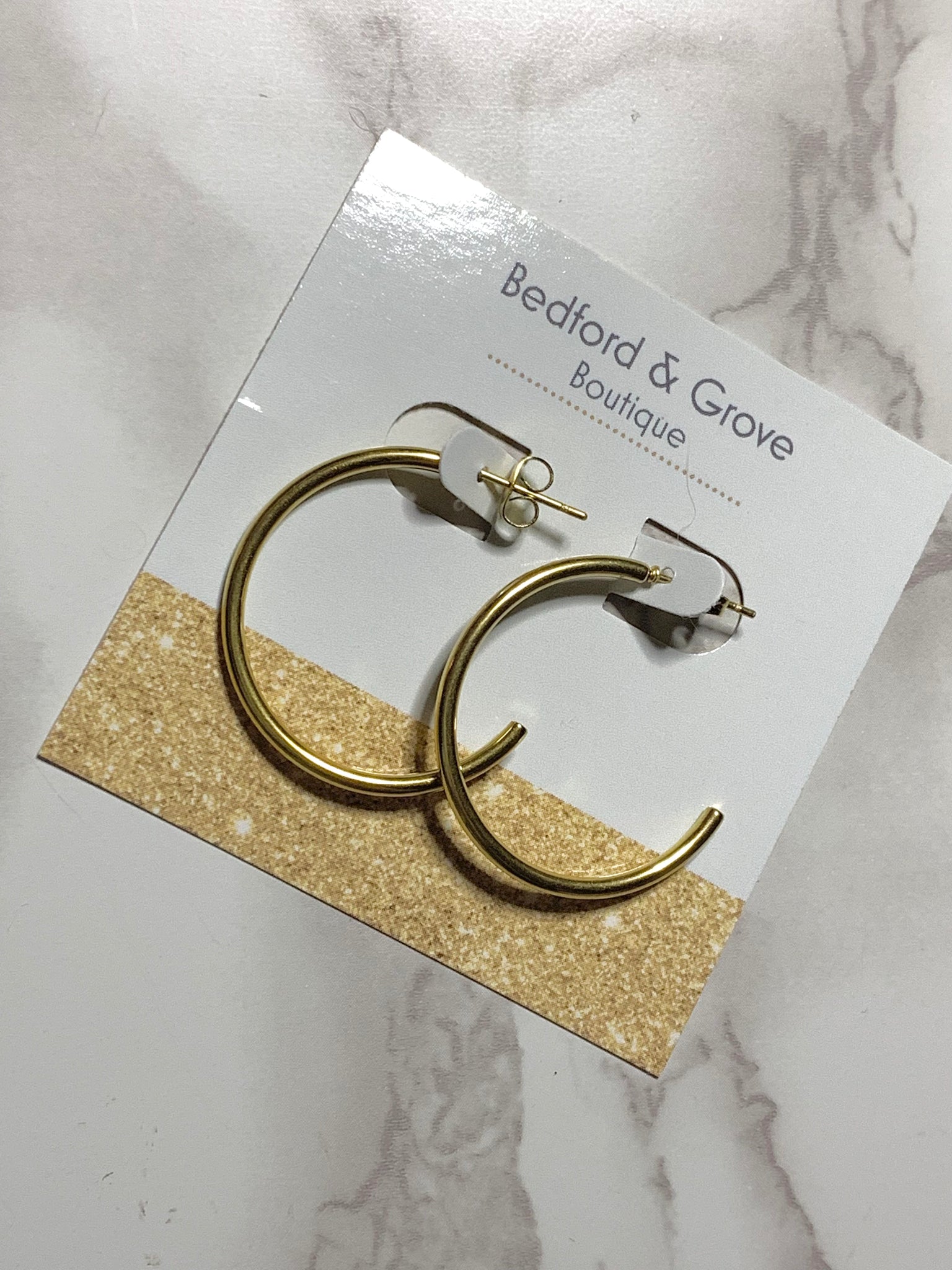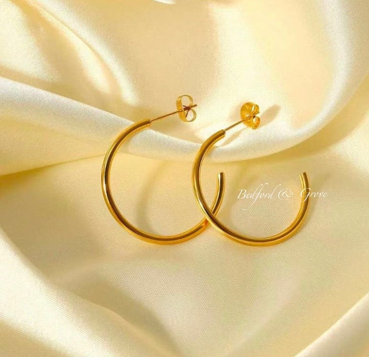 Our Trendsetter hoops are sure to do just that: Set the bar for trendy. The perfect, classic, lightweight hoop has been put together with the result of comfort for sensitive ears, even for all day wear and 18k gold plated stainless steel for superior durability that resists tarnish.